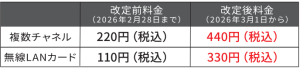 このたび、「光ギガ」「CLOUD LINE」にて提供中の有料オプション(複数チャネル・無線LANカード)におきまして、サービス提供環境の維持およびコスト上昇の影響に伴い、2026年3月1日(日)ご利用分より料金を改定させていただくことになりました。